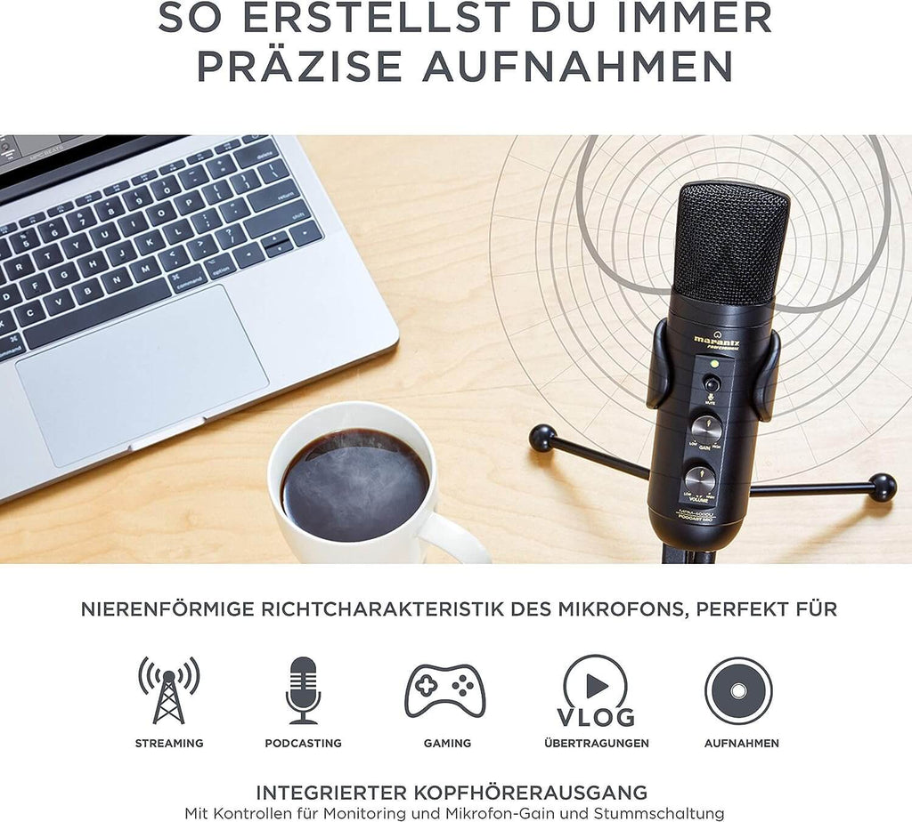 Wenn Sie für Ihren nächsten Podcast einen professionellen Sound benötigen, sollten Sie sich nicht mit einem beliebigen Mikrofon zufrieden geben, sondern ein Mikrofon vom Broadcast-Spezialisten Marantz Professional wählen! Das Herzstück des MPM-4000U Podcast-Mikrofons ist eine 14-mm-Kondensatorkapsel mit reinem Aluminiumüberzug und einer Richtcharakteristik mit Nierencharakteristik. Das Ergebnis? Sie nehmen nur das auf, was Sie wollen, und zwar mit jeder feinen Nuance der Audioquelle - und das bei minimaler Beeinträchtigung durch unerwünschte Umgebungsgeräusche.