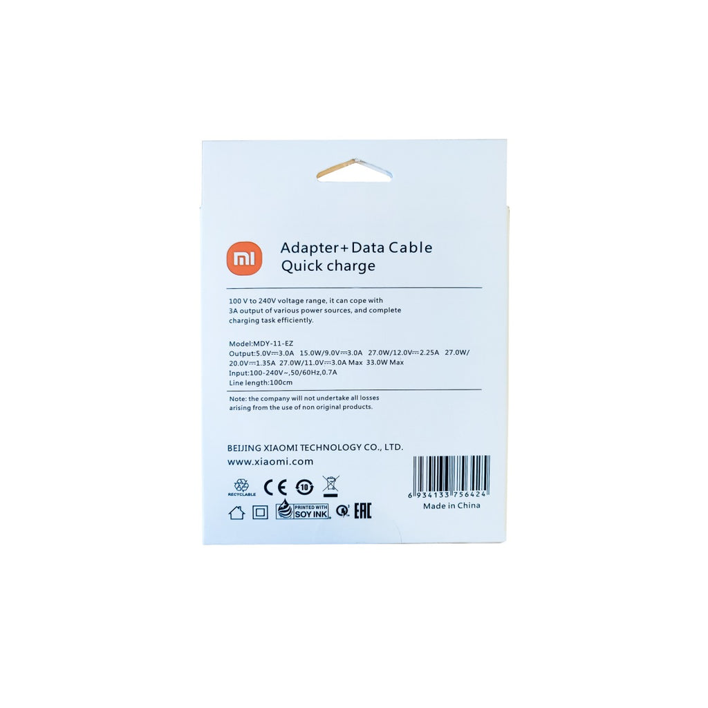 Lieferumfang: Original Xiaomi USB QuickCharge Schnelladegerät MDY-11-EZ, 3A / 3000 mAh 33 Watt + USB Typ-C Lade / Datenkabel 1 Meter