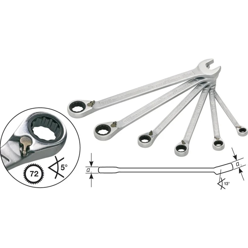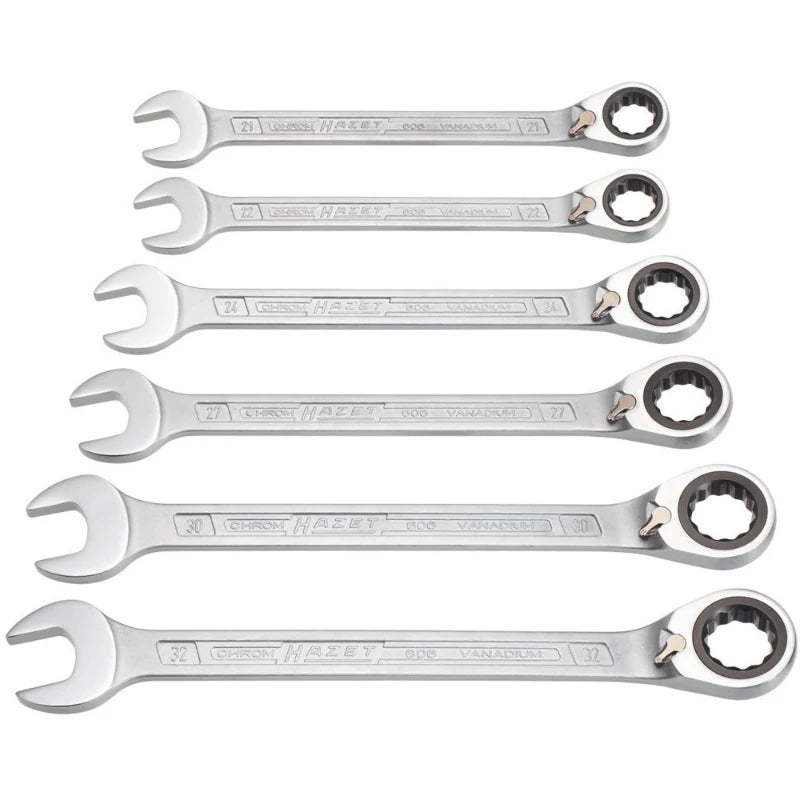 Der HAZET Knarren-Ring-Maulschlüssel-Satz 606/6-1 in der langen, schlanken Ausführung verfügt über beidseitig gleiche Schlüsselweiten. Der Schaft mit extra stabilem HAZET-Doppel-T-Profil ist verchromt, die Schlüsselköpfe sind poliert. Die Ringseiten (Doppel-Sechskant) verfügen über eine umschaltbare Knarrenfunktion zur Betätigung schwer zugänglicher Schraubverbindungen auf engstem Raum, ohne Umsetzen des Schlüssels, außerdem über das von HAZET speziell für Schraubenschlüssel und Steckschlüssel entwickelte Tractionsprofil ohne scharfe Kanten oder Spitzen. Durch die vergrößerte Anlagefläche des Tractionsprofils im Schlüssel wird eine sichere Übertragung des Drehmoments ermöglicht und die Kerbwirkung auf ein Minimum reduziert. Das schützt den Schraubenkopf optimal vor Beschädigungen und Eckverschleiß. Sogar beschädigte und abgenutzte Schrauben lassen sich mit dem Tractionsprofil noch sicher lösen, da ein Durchdrehen oder Abrutschen fast ausgeschlossen ist.